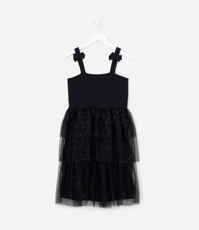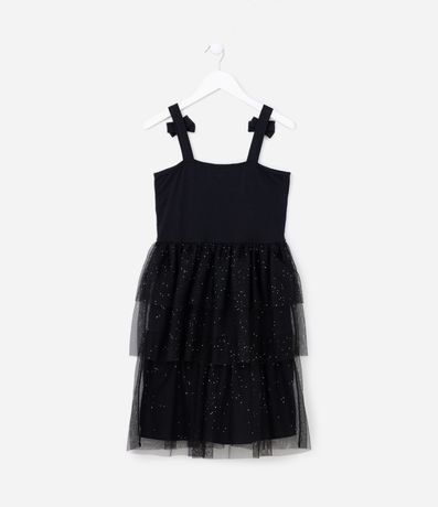 Ref: Vestidinho infantil em tule, com alças médias, laços aplicados e saia em tule com babadinhos e brilhos.