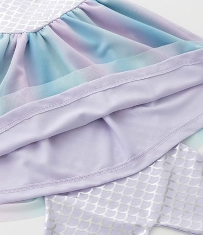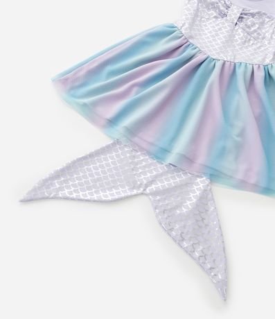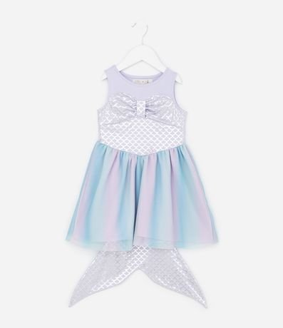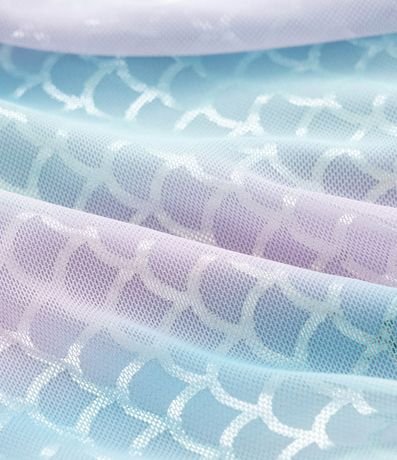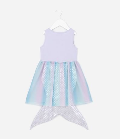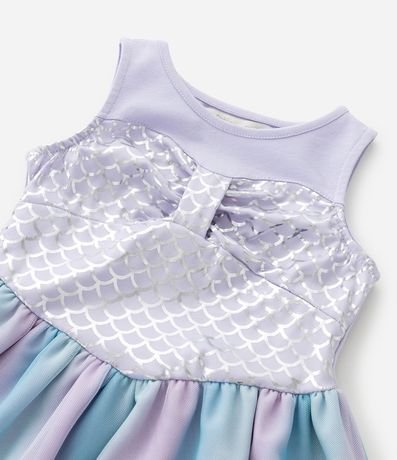 Ref: Vestido infantil confeccionado em tule, com gola redonda e busto de regatinha. Possui estampa metalizada de escamas e cauda de sereia.