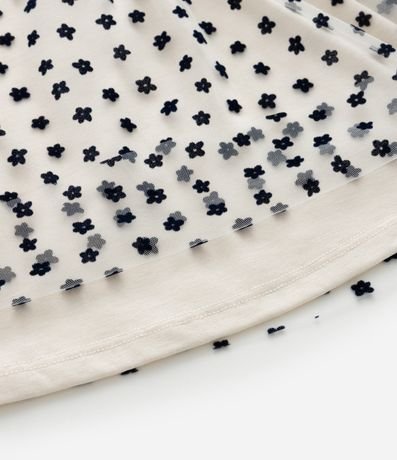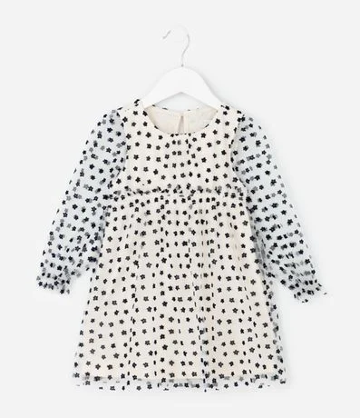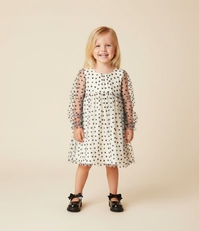 Vestidinho infantil confeccionado em tule, com gola redonda e mangas longas bufantes, estilo manga princesa. Possui recorte franzido na cintura, textura de florzinhas contrastantes e abertura em gota nas costas.