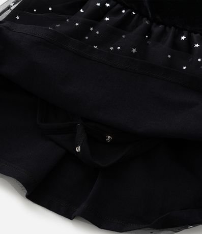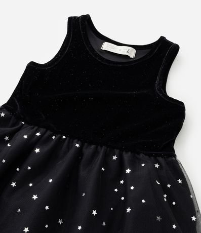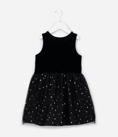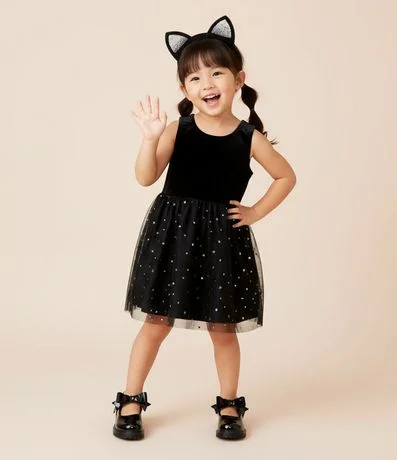 Ref: Vestido infantil confeccionado em veludo mais sustentável através de boas práticas ambientais. Possui gola redonda, sem mangas, com saia de tule, estampada de estrelinhas. Acompanha tiara de gatinha.