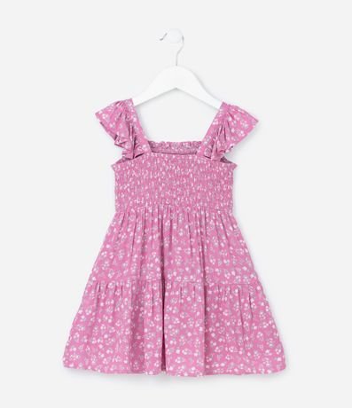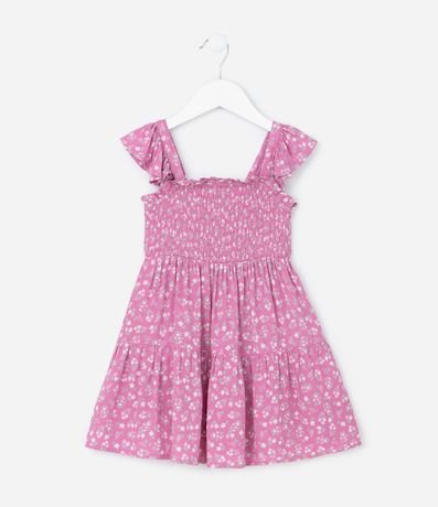 Ref: Vestidinho infantil confeccionado em viscose mais sustentável. Possui decote quadrado, alcinhas, com frufru, elástico na parte superior, babadinho e estampa de florzinhas.