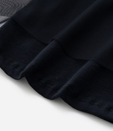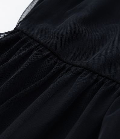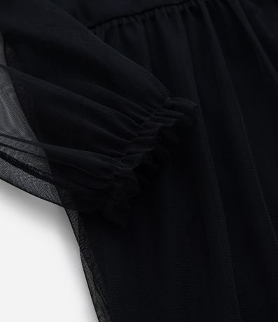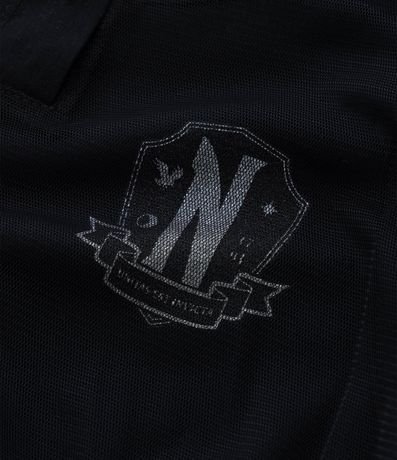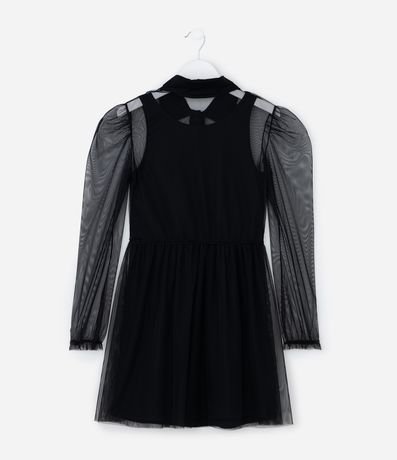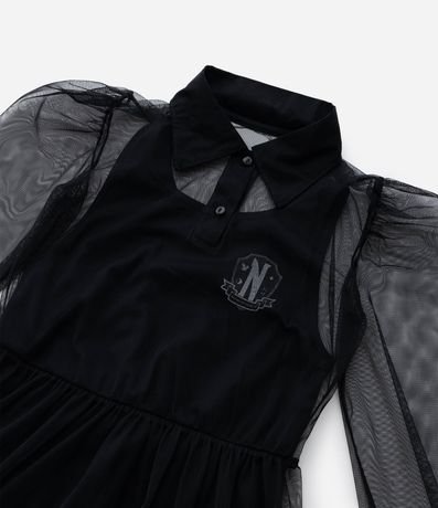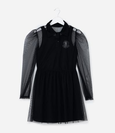 Ref: Vestido infantil confeccionado em poliéster com tule mais sustentável através de boas práticas ambientais. Possui gola polo, com botões, regata, estampa localizada Wandinha e tule manga longa.