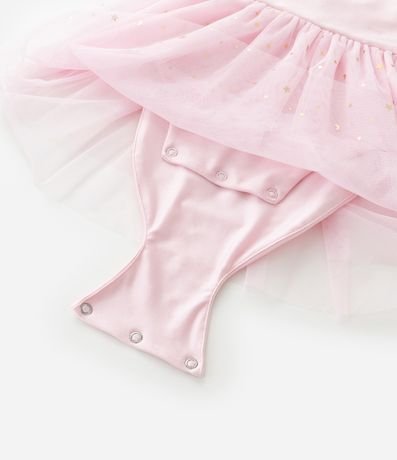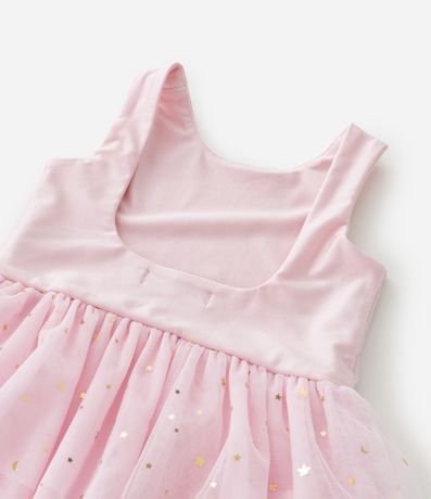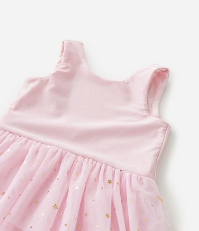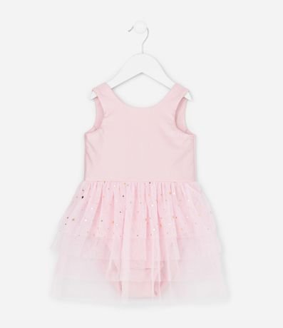 Ref: Vestido infantil sem manga com corpo liso e modelagem reto, confeccionado em material leve. Possui saia em tule com camadas e glitter, criando volume delicado no estilo bailarina, além de body interno com botões para maior praticidade no vestir.