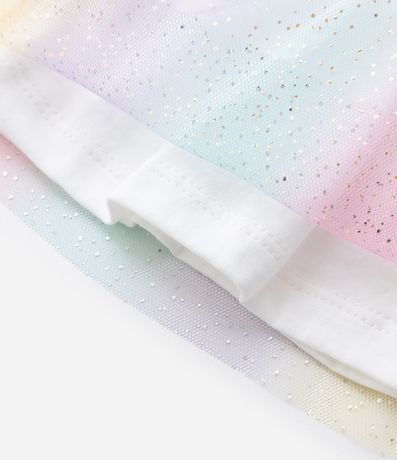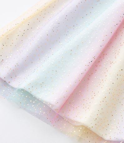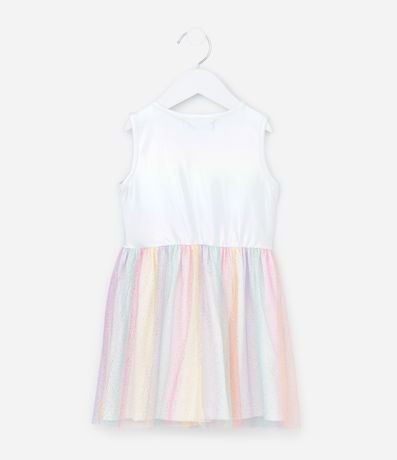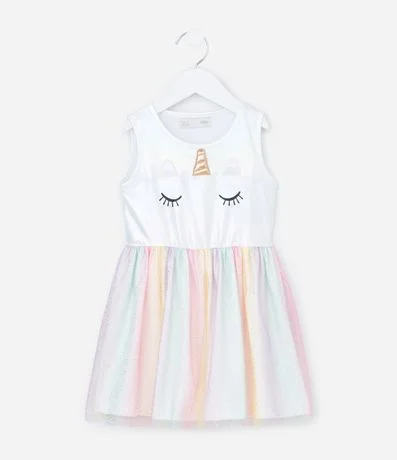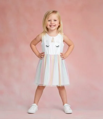 Ref: Vestido infantil sem manga confeccionado em algodão certificado BCI e boas práticas ambientais. Possui parte superior com estampa de unicórnio estilizada, gola redonda e saia multicolorida em tule com brilho, criando movimento leve e toque mágico para composições festivas.