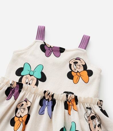 Ref: Vestidinho infantil confeccionado em algodão mais sustentável, com textura e alças elásticas, possui estampa de carinhas da Minnie e babadinho na cintura.