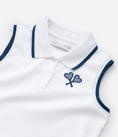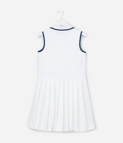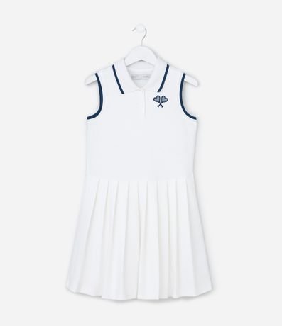 Ref: Vestido infantil texturizado, confeccionado em algodão de material mais sustentável. De estilo esportivo tenista, com gola polo, bordado de raquetes no peito e saia plissada.