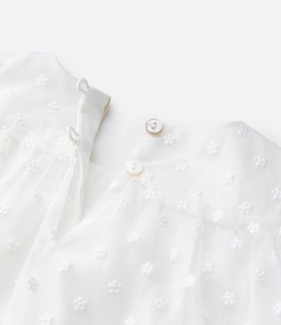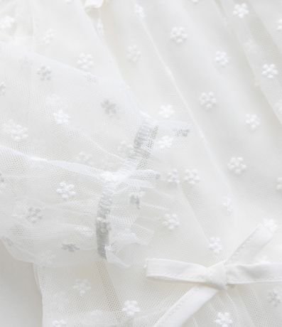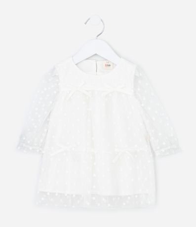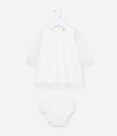 Vestido infantil em tule bordado com laços aplicados, trazendo mangas longas e modelagem leve acompanhada de calcinha com babados. A peça possui forro macio em algodão certificado BCI e boas práticas ambientais,.