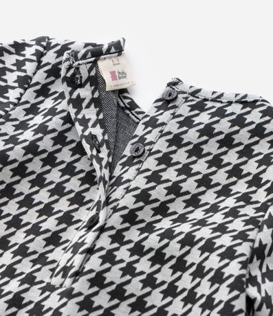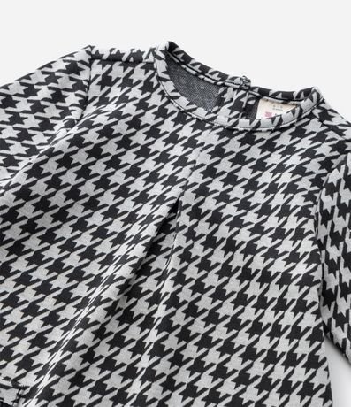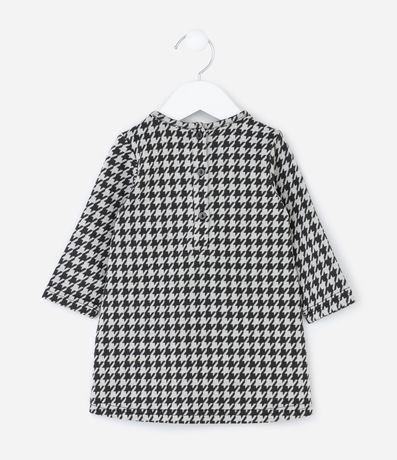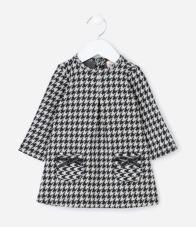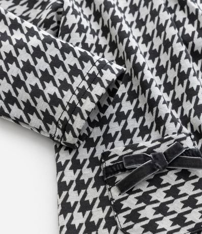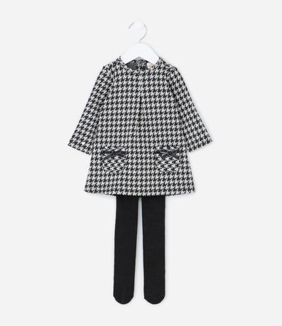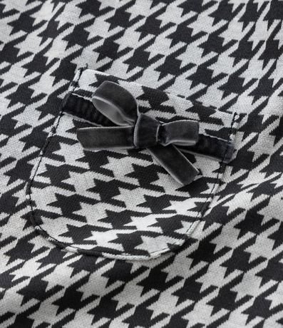 Vestido infantil confeccionado em poliéster certificado GRS, com toque macio e caimento confortável. Possui gola redonda, mangas longas e abotoamento no ombro para facilitar o vestir. Traz estampa pied de poule, bolsos frontais com laços em veludo e acompanha meia calça.