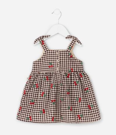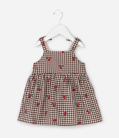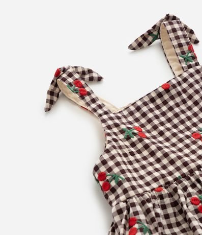 Ref: Vestido infantil confeccionado em algodão certificado BCI, com tricoline leve e respirável. Possui decote reto, alças com laços ajustáveis, padronagem xadrez vichy fullprint e bordados delicados com elementos de joaninha, remetendo ao clima lúdico das festas juninas. Acompanha calcinha em tecido macio para maior conforto do bebê.