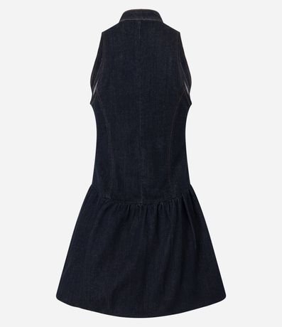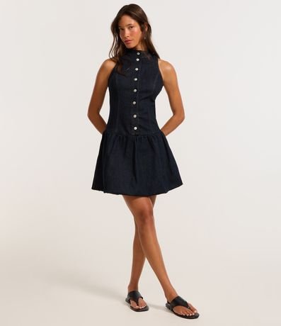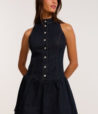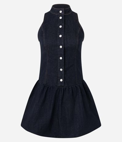 Ref: Vestido feminino de modelo curto, confeccionado em jeans, com gola halter e saia balonê. Sem estampa, possui abotoamento frontal total.