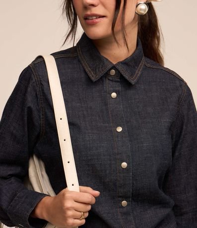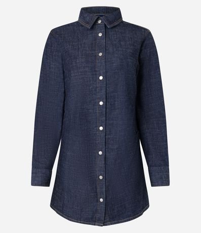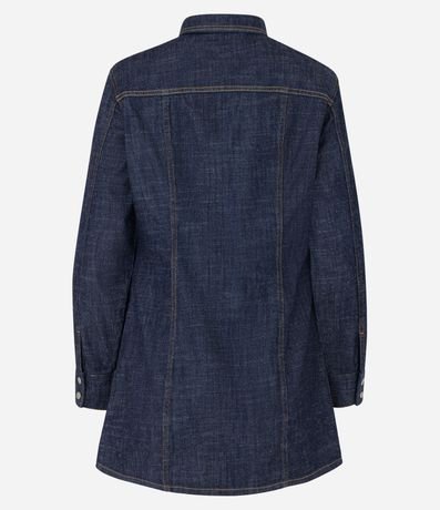Vestido feminino, confeccionado em jeans, com abotoamento frontal, mangas longas e pespontos contrastantes.
