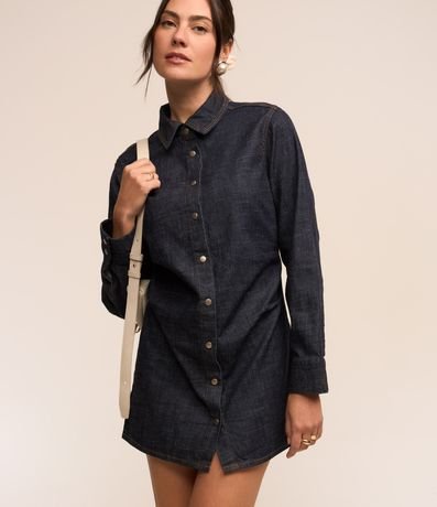 Vestido Jeans com Pregas nas Laterais e Abotoamento