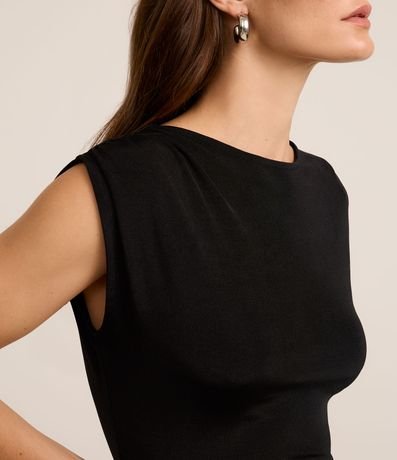 Vestido sem manga com textura canelada, confeccionado com elastano produzido através de boas práticas ambientais e com detalhes drapeados.