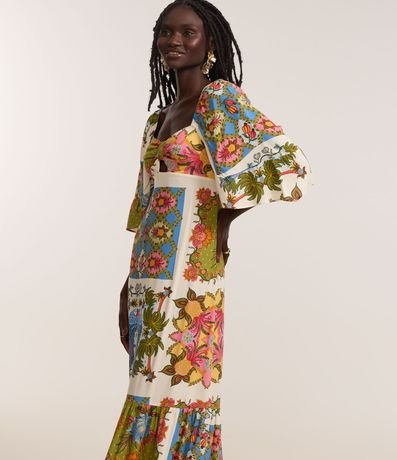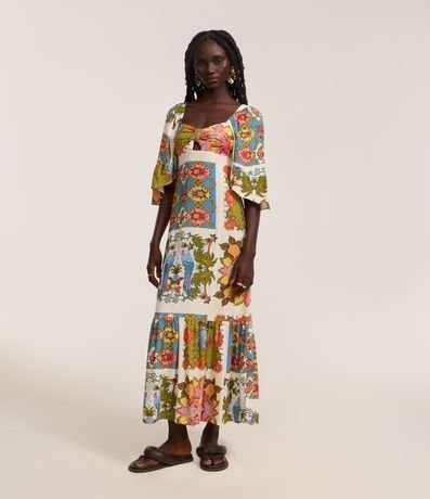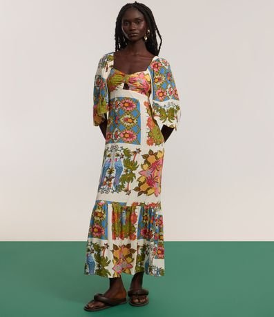 Ref: Vestido feminino confeccionado em viscose certificada no modelo long midi, com decote coração, manga curta com ponta e estampa tropical.