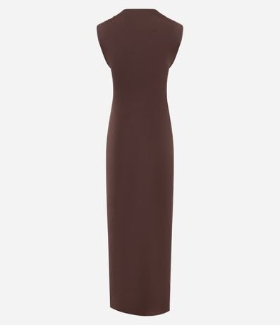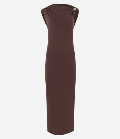 Vestido long midi, sem mangas, com decote assimétrico, aviamento na alça e franzidos.