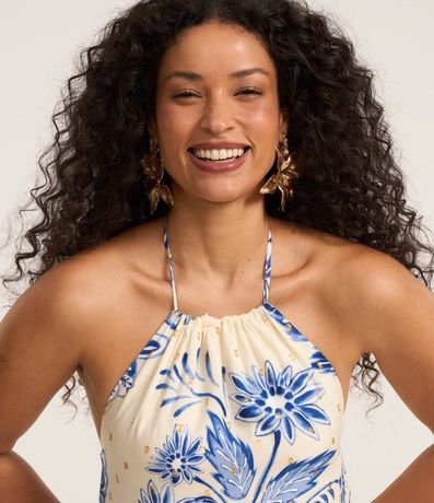 Ref: Vestido feminino de comprimento long midi, confeccionado em viscose chalis, com decote halter e franzido no busto. Leve a peça possui a saia soltinha com babados, estampa floral estilo azulejo e detalhes brilhosos em fio metalizado.