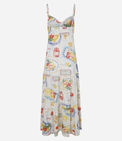 Vestido Long Midi de Alça em Algodão com Frutas Estampadas