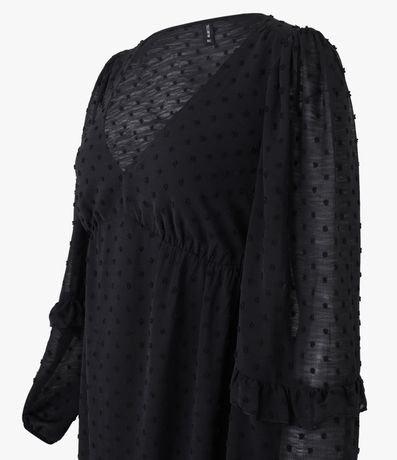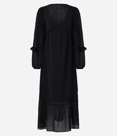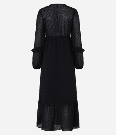Vestido long midi com manga longa, confeccionado em crepe produzido através de boas práticas ambientais, texturizado e com babado na barra.