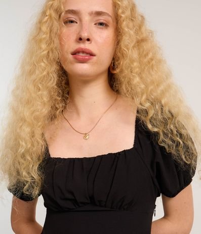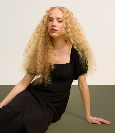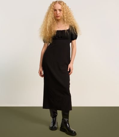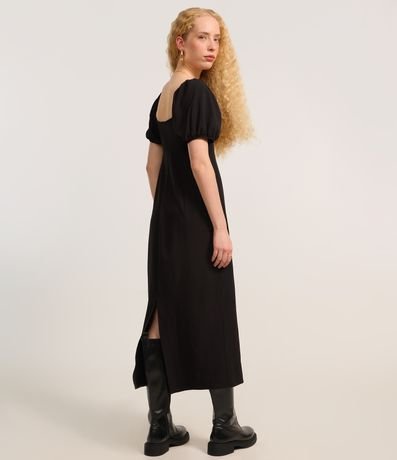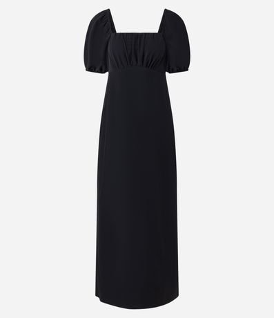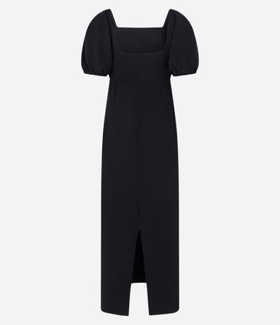 Ref: Vestido long midi com manga curta bufante, decote coração, confeccionado em crepe e com fenda na parte de trás.