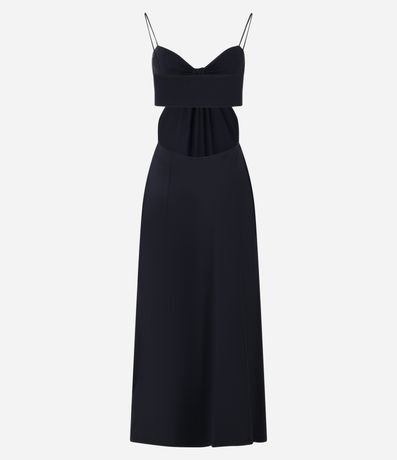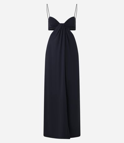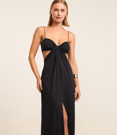 Vestido long midi, reto com alcinha fina, decote com drapeado no busto, recorte cut out na lateral e confeccionado em helanca.
