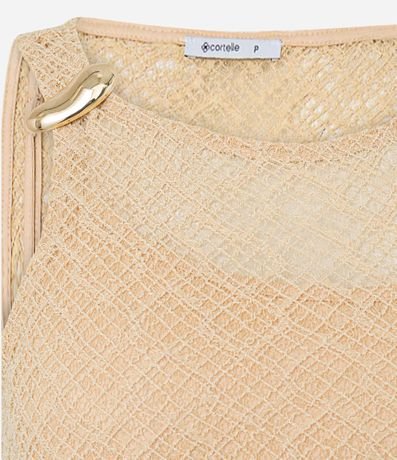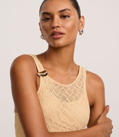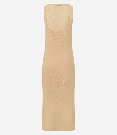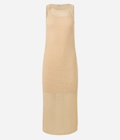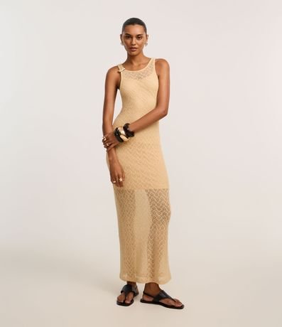 Ref: Vestido longo mid, sem mangas, confeccionado em renda, com decote redondo, alças largas, aviamento metalizado no ombro e pontos abertos. Peça com forro.