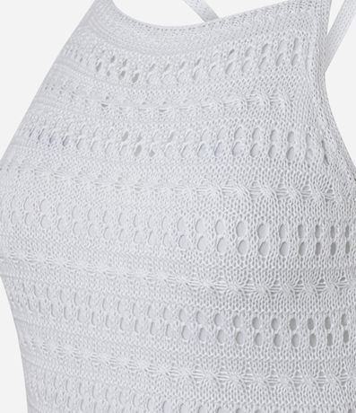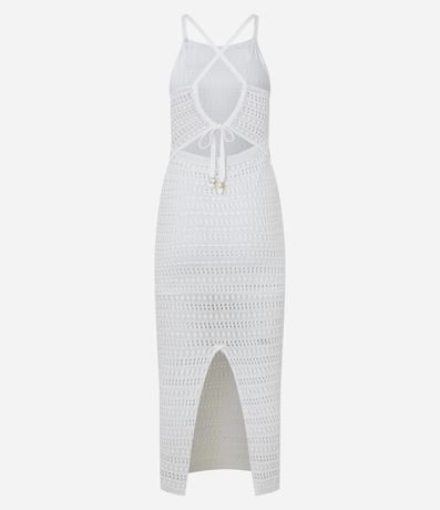 Ref: Vestido feminino confeccionado em tricô no modelo long midi com frente única, gola redonda, alças finas cruzadas nas costas, amarração e fenda traseira.