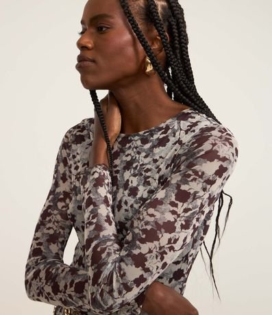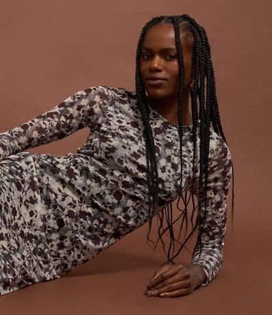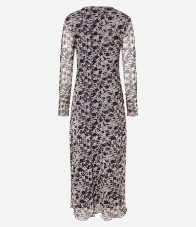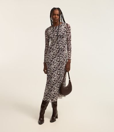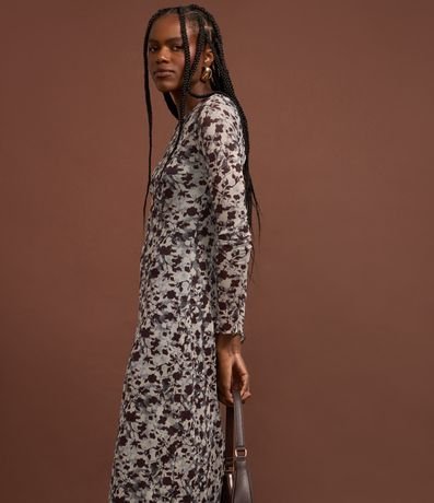 Ref: Vestido long midi, todo confeciconado tule através de boas práticas ambientais, com mangas longas e gola redonda. Peça tem frufrus na barra, transparência nas mangas e estampa de flores.