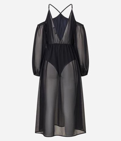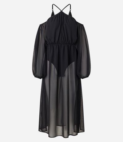 Ref: Vestido feminino confeccionado em tule, peça com com decote ombro a ombro, tiras finas ajustáveis, decote em v nas costas. Peça com tule transparente longo, manga longa ajustada e seu forro de macaquinho com hot pants.