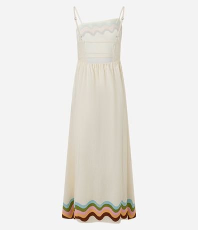 Ref: Vestido long midi confeccionado em viscolinho mais sustentável, no modelo long midi. Possui decote assimétrico, alças finas reguláveis e estampa tropical.