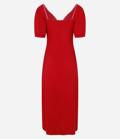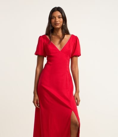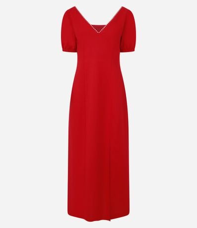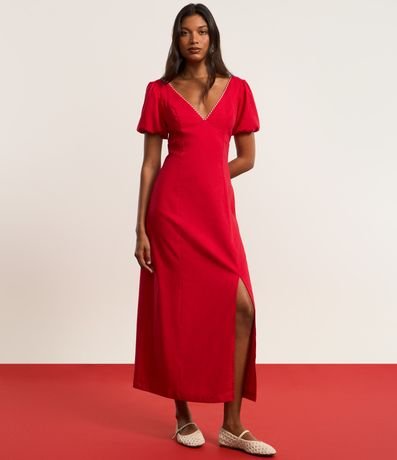 Ref: Vestido long midi com manga curta, confeccionado em viscolinho com viscose certificada mais sustentável, produzido através de boas práticas ambientais e detalhe de aviamentos no decote v.
