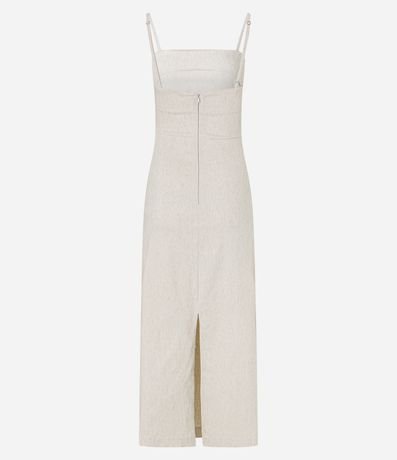 Ref: Vestido de viscolinho composto, entre outros, por linho e viscose certificada. A peça alongada tem alcinhas reguláveis, decote reto, zíper nas costas, fenda traseira na barra e drapeado na cintura.