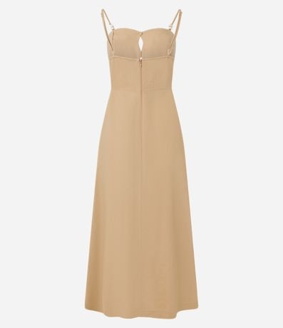 Vestido long midi com alcinha fina, decote coração com recorte vazado no busto, confeccionado em viscolinho com viscose certificada e produzido em boas práticas ambientais.