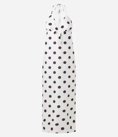 Ref: Vestido longo em viscolinho com estampa poá e decote em V. Possui alças finas ajustáveis e amarração no busto, garantindo melhor caimento. Leve e moderno, é ideal para produções frescas da temporada, confeccionado com boas práticas ambientais e algodão naturalmente colorido.