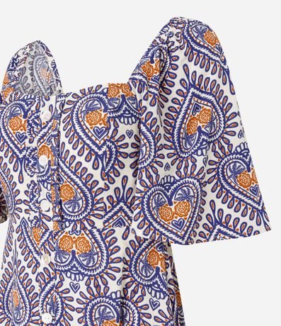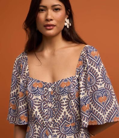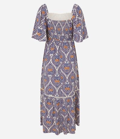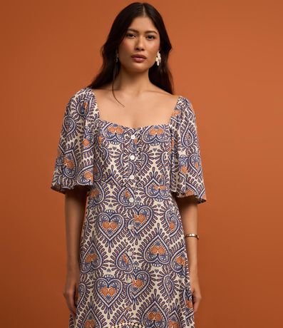 Ref: Vestido long midi confeccionado em viscose mais sustentável e estampado de corações com abacaxi. O vestido tem mangas curtas evasê, decote coração, babado maria na barra e botões frontais.