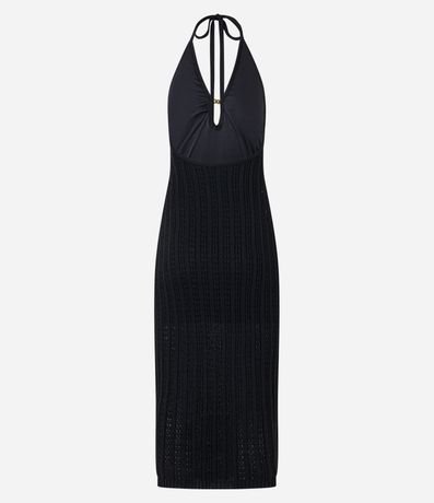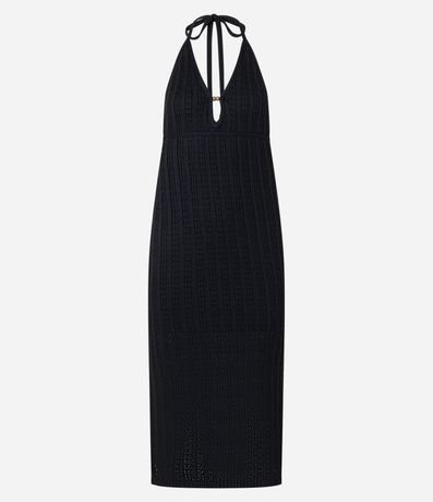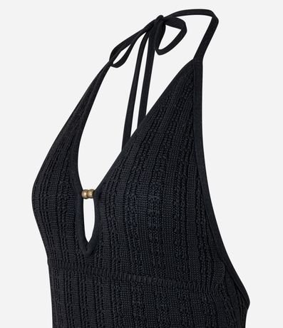 Ref: Vestido feminino em tricô no modelo long midi com decote em v, frente única, amarração no pescoço por alça média, detalhe de miçangas no decote, sem manga.