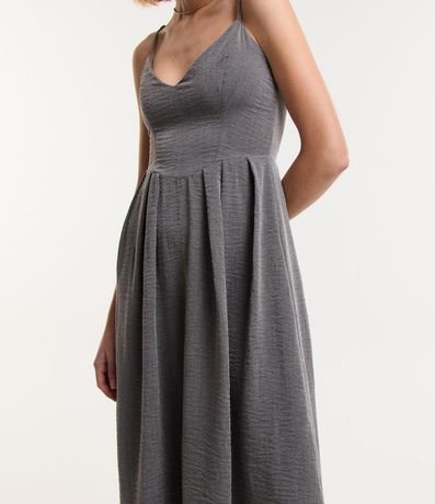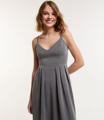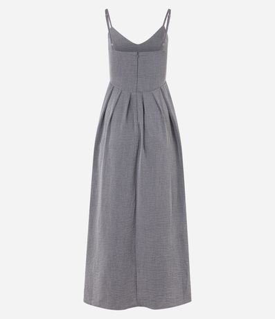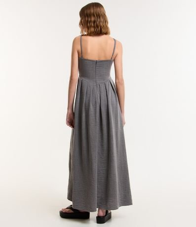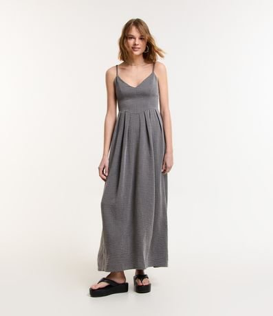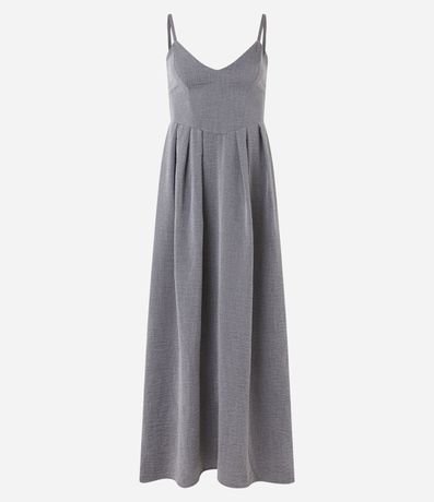 Ref: Vestido longo feminino alfaiatado, com decote V, alcinha fina, recorte na cintura e superfície sem estampa.