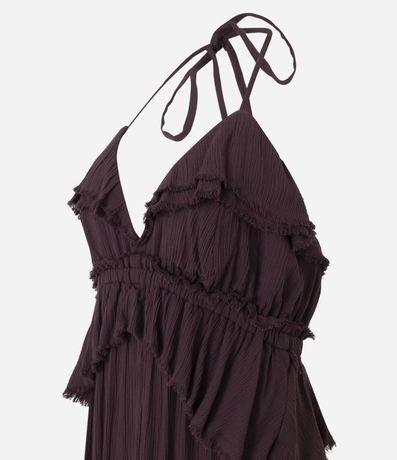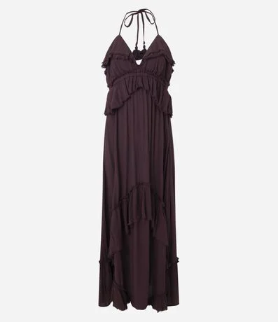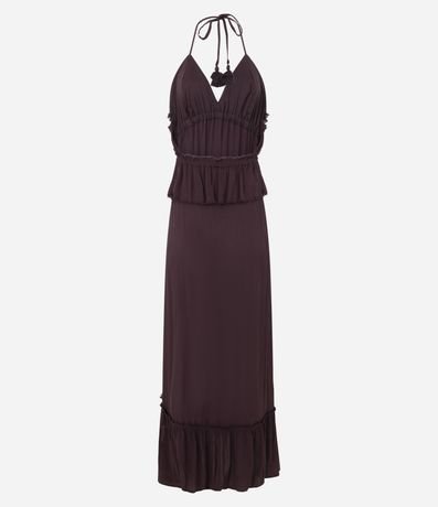 Vestido longo em viscose com babados aplicados e decote em V, trazendo movimento e feminilidade ao visual. Possui amarração no pescoço e caimento leve que valoriza a silhueta. Peça elegante para diversas ocasiões, confeccionada em viscose certificada.