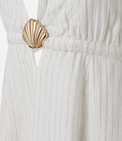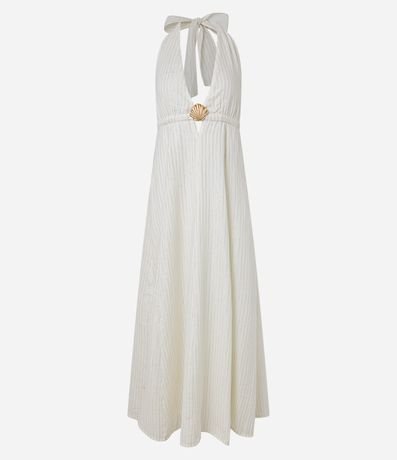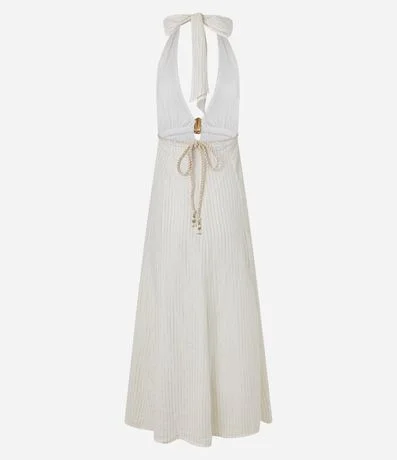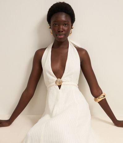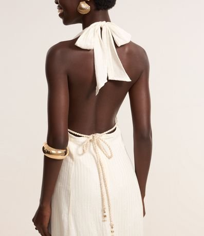 Ref: Vestido feminino confeccionado em crepe de algodão certificado bci, peça no modelo longo com frente única, amarração no pescoço, maxi pingente de conta contrastante, fio metalizado, amarração de corda nas costas.