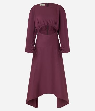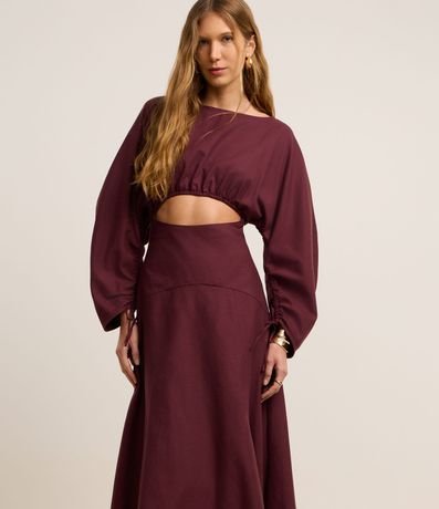 Ref: Vestido longo, confeccionado em tricoline texturizado com percentual de linho, com decote redondo, fechamento por zíper nas costas, punhos com amarração e mangas longas. Peça tem fechamento nas costas, abertura vazada abaixo do busto e recorte na parte detrás da barra. Dispõe de franzidos no vazado e nas amarrações dos punhos. Este produto possui algodão certificado BCI em sua composição, além de ter sido produzido através de processos mais sustentáveis com boas práticas ambientais, sendo ambientalmente mais responsável.