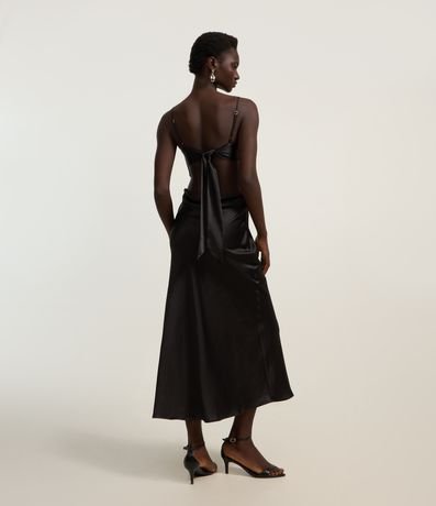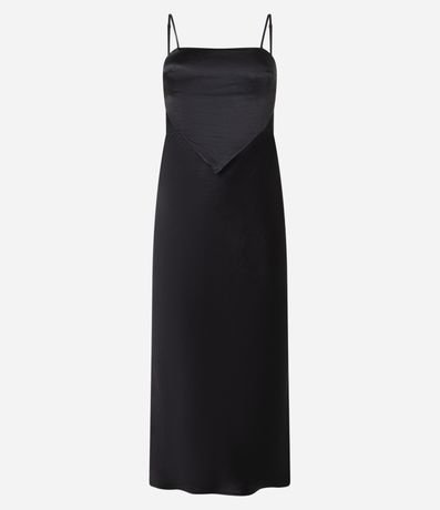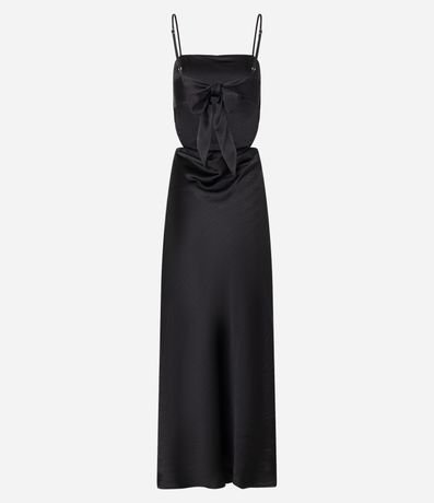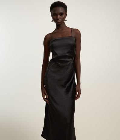 Vestido de modelo longo confeccionado em cetim, com boas práticas ambientais. Possui alças finas e reguláveis, decote reto, recorte frontal em formato V e amarração nas costas.