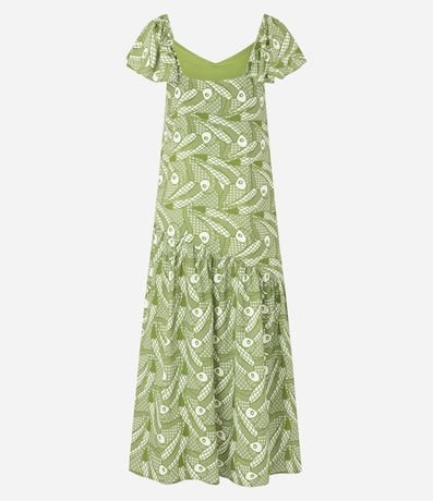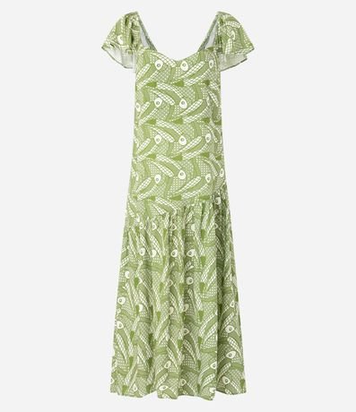 Vestido longo confeccionado em chalis de viscose certificada - um tecido frequinho, ideal para dias quentes. A peça tem mangas curtas soltinhas, decote quadrado, babado maria assimétrico e estampa bicolor de tucanos grandes.