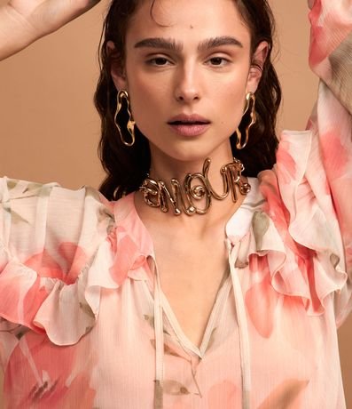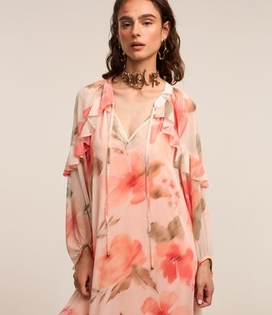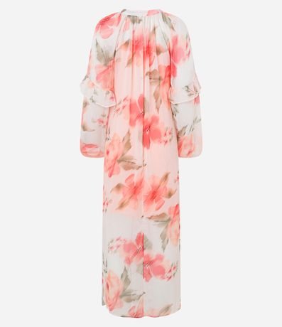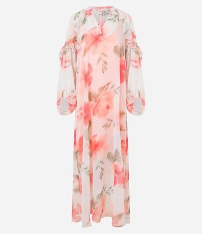 Ref: Vestido longo feminino, confeccionado em chiffon, com decote V, amarração, mangas longas bufantes e detalhadas e estampa floral.