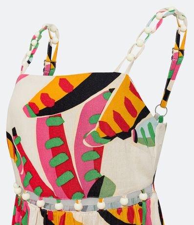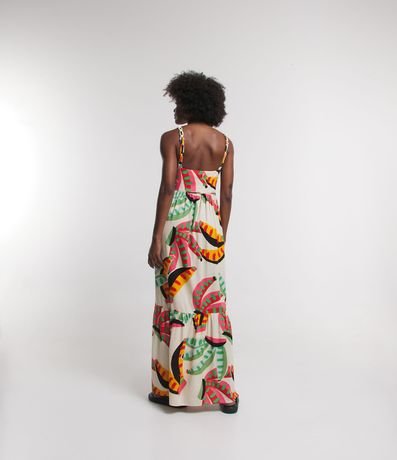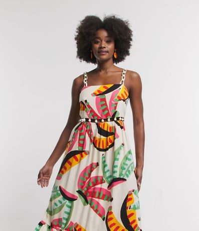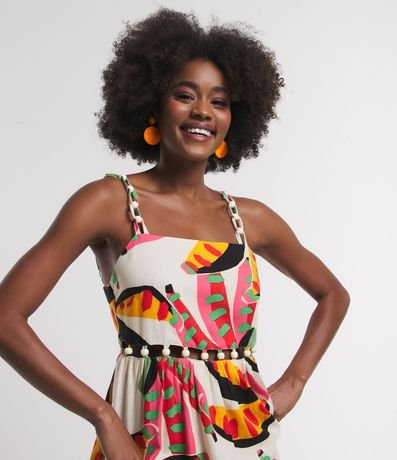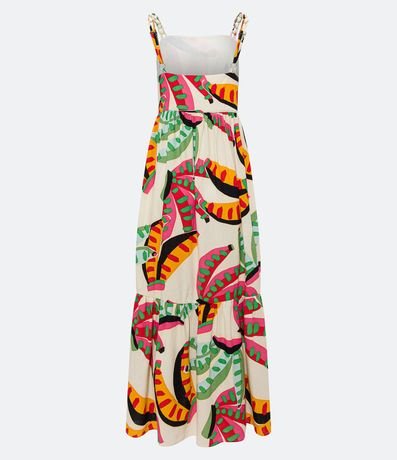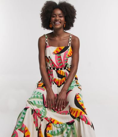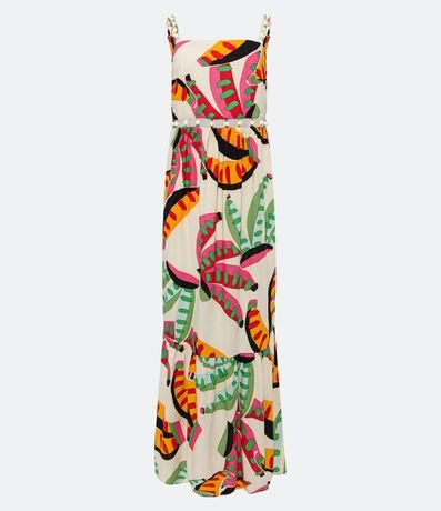 Vestido longo, em linho, com aviamentos de bolinhas nas alças e no recorte frontal, estampa tropical e confeccionado em material mais sustentável.