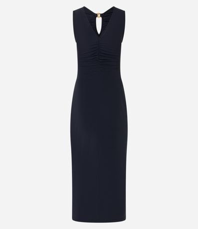 Vestido reto alongado e sem mangas, confeccionado em poliamida, com decote diferenciado com aviamento metalizado no busto, decote V nas costas e franzidos. Este produto foi fabricado através de processos mais sustentáveis, adotando boas práticas ambientais.