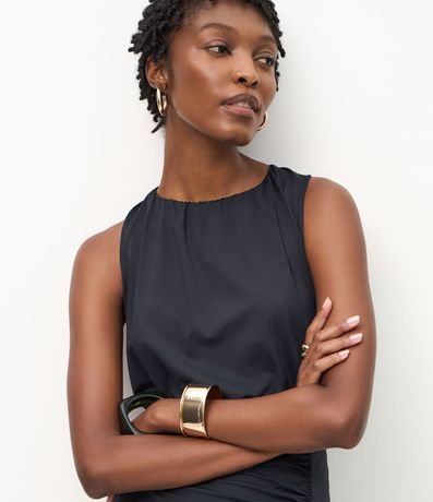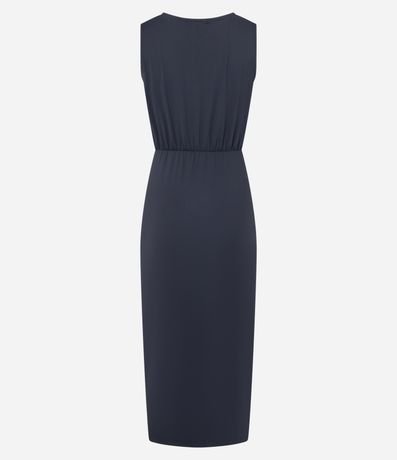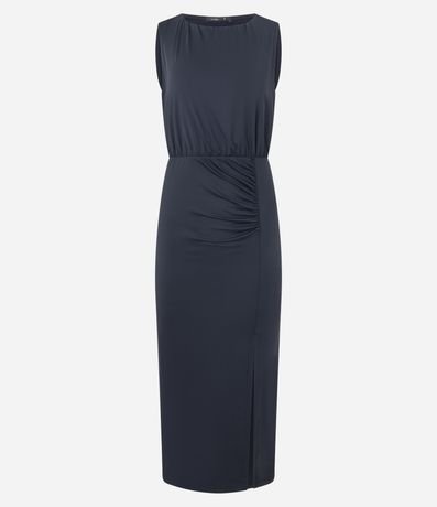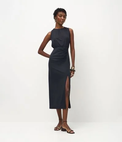 Ref: Vestido feminino confeccionado em poliamida, sem mangas, com decote franzido que cria volume elegante. Possui recorte na cintura, drapeado lateral e fenda alta que valoriza o movimento.