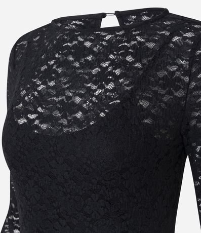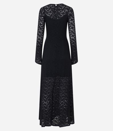 Vestido longo feminino em renda com manga longa, modelagem reta e leve transparência. Possui decote fechado, forro interno curto e barra alongada em renda vazada.