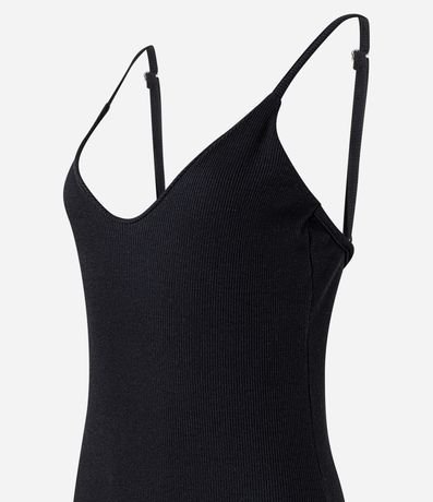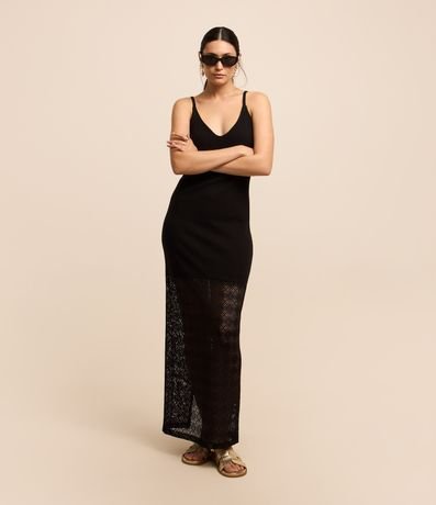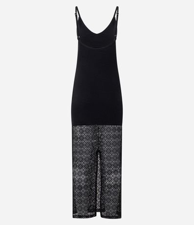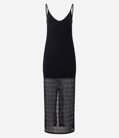 Vestido alongado de alcinhas finas reguláveis confeccionado em ribana com decote V e costas decotadas. Dispõe de saia em renda com padrões geométricos com leve transparência além de fenda frontal.