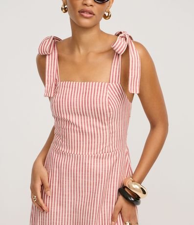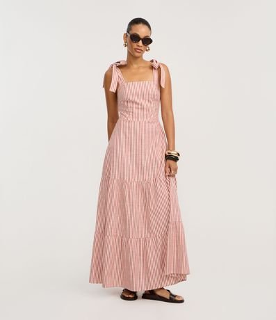 Vestido Longo em Sarja com Laço na Alça e Listras