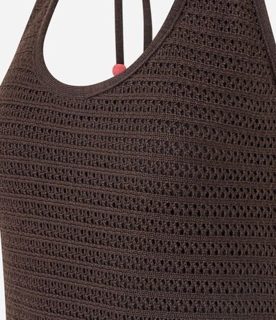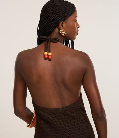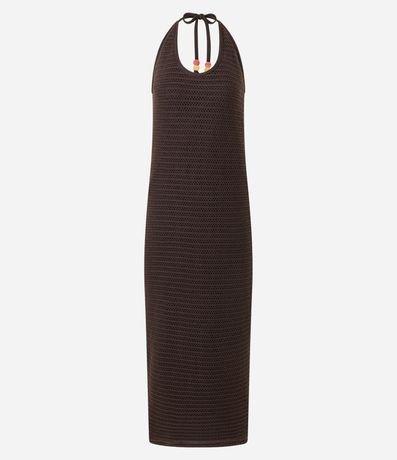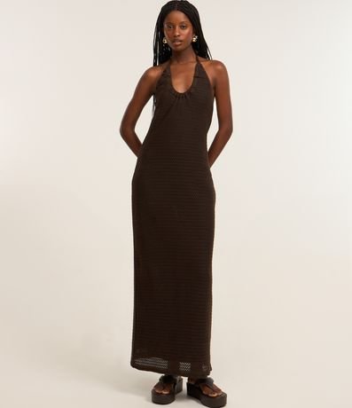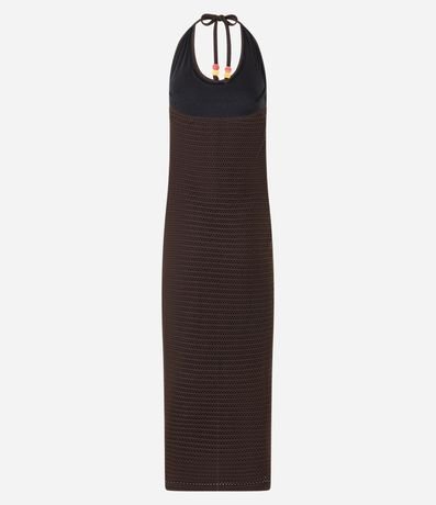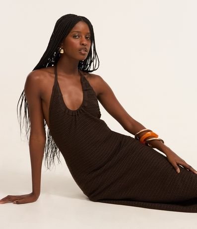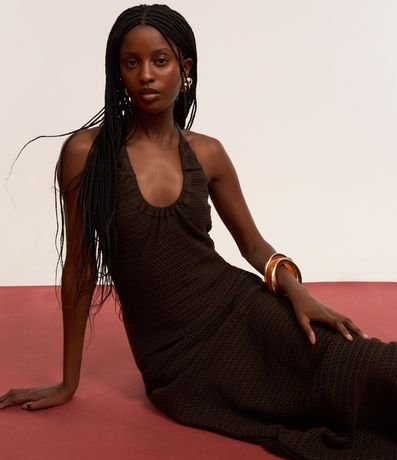 Vestido feminino de comprimento longo, confeccionado em tricô, sem estampa e com decote frente única. Possui amarração no pescoço e ponteiras coloridas.