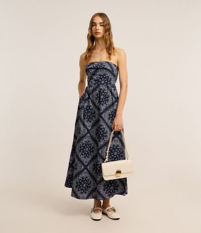 Ref: Vestido longo confeccionado em tricoline, com decote reto e sem alças. Possui recorte na cintura, lastex nas costas e estampa em padronagem paisley.